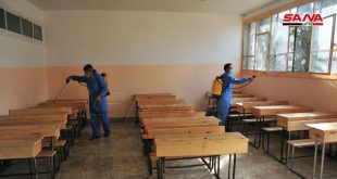 دمشق-سانا مع اقتراب موعد افتتاح المدارس وعودة الطلاب لمقاعد الدراسة تكثف مديرية تربية دمشق حملة تعقيم وتنظيف المدارس لتأمين بيئة نظيفة داخل الشعب الصفية والمرافق العامة والأسطح وخزانات ودورات المياه بشكل كامل حيث شملت الحملة اليوم مدرسة “الشهيدة غالية فرحات” …