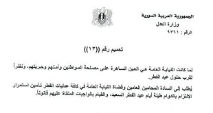 دمشق-سانا طلبت وزارة العدل في تعميم أصدرته اليوم من المحامين العامين وقضاة النيابة العامة تأمين استمرار العمل في جميع العدليات طيلة أيام عيد الفطر. وجاء في التعميم الذي تلقت سانا نسخة منه.. لما كانت النيابة العامة هي العين الساهرة على …