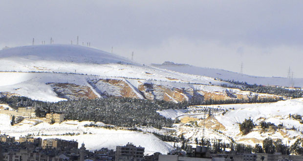 السويداء -سانا هطل الثلج بغزارة على معظم مناطق سورية وكان للسويداء النصيب الأكبر منه حيث بلغت سماكة الثلوج 200سم في سالي بالسويداء.