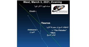 دمشق-سانا يقترن اليوم الكوكب ذو الوشاح الأحمر المريخ بالشقيقات السبع كوكبة الثريا عند الساعة 26ر01 صباحاً بتوقيت دمشق. وفي تصريح لـ سانا أشار عضو مجلس إدارة الجمعية الفلكية السورية نبيل البيش إلى أن الكوكب الأحمر المريخ ومجموعة نجوم الثريا المعروفة …
