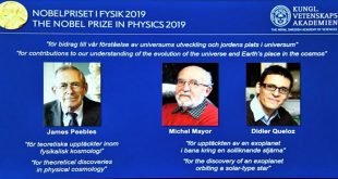 استوكهولم-سانا أعلنت الهيئة المانحة لجوائز نوبل اليوم فوز العلماء الكندي الأمريكي جيمس بيبلز والسويسريين ميشيل مايور وديدييه كويلو بجائزة نوبل للفيزياء لعام 2019 . ونقلت وكالة رويترز عن الأكاديمية الملكية السويدية للعلوم قولها في بيان إن “جائزة نوبل للفيزياء منحت …