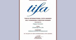 طوكيو-سانا فاز المغترب السوري المصور الوثائقي هاغوب وانيسيان بجائزة الشرف عن فئة التحرير الحرب الصراع في مسابقة جوائز طوكيو الدولية للتصوير الفوتوغرافي عبر لوحته التي حملت عنوان تحدي للحياة. وعن ظروف الفوز بالجائزة التي أعلن عنها اليوم قال وانيسيان في …