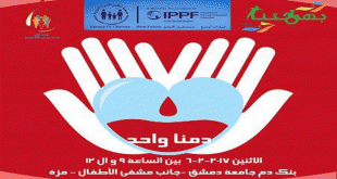 دمشق-سانا “دمنا واحد” هو عنوان الحملة التي أطلقتها مؤخرا مبادرة “بهمتنا” التي تعنى بمشاركة ذوي الإعاقة الحركية في المجتمع بالتعاون مع فريق “نبضة أملط لدعم مرضى التلاسيميا في دمشق حيث سعت الحملة التي أقيمت في مركز نقل الدم بالجامعة الى …