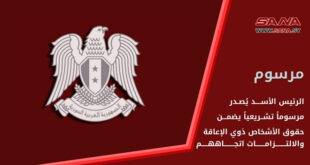 دمشق-سانا أصدر السيد الرئيس بشار الأسد المرسوم التشريعي رقم (19) لعام 2024 المتعلق بحقوق الأشخاص ذوي الإعاقة والتزامات الجهات العامة والخاصة تجاههم. ويهدف المرسوم إلى حماية الأشخاص ذوي الإعاقة، وضمان الدمج الشامل لهم في المجتمع ويحدد دور مختلف الجهات في …