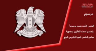المزيدالرئيس الأسد يصدر مرسوماً يتضمن أسماء الفائزين بعضوية مجلس الشعب للدور التشريعي الرابع