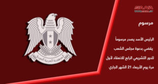 المزيدالرئيس الأسد يصدر مرسوماً يقضي بدعوة مجلس الشعب للدور التشريعي الرابع للانعقاد لأول مرة يوم الأربعاء 21 الشهر الجاري
