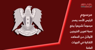 دمشق-سانا أصدر السيد الرئيس بشار الأسد اليوم المرسوم التشريعي رقم (22) لعام 2024 القاضي بتعديل المادة (1) من القانون رقم (18) لعام 2019، بحيث يتم رفع نسبة تعيين الخريجين الأوائل من المعاهد والأقسام والتخصصات التي تمنح درجة دبلوم تقاني في …