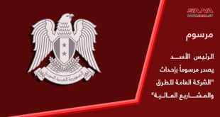 دمشق-سانا بهدف تطوير عمل الشركات الإنشائية العامة وإعادة هيكلتها وفق مسار متكامل يحقق الاستثمار الأمثل لإمكاناتها البشرية والمادية ويقلل من الهدر، أصدر السيد الرئيس بشار الأسد اليوم المرسوم رقم (98) لعام 2024 القاضي بإحداث “الشركة العامة للطرق والمشاريع المائية” لتحل …