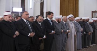 دمشق-سانا أدى السيد الرئيس بشار الأسد اليوم صلاة عيد الفطر المبارك في رحاب مسجد الصفا بحي طريق الشام بحمص. وأدى الصلاة مع الرئيس الأسد وزير الأوقاف الدكتور محمد عبد الستار السيد والمفتي العام للجمهورية الدكتور أحمد بدر الدين حسون ومحافظ …