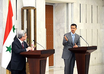 دمشق-سانا عقد السيد الرئيس بشار الأسد والرئيس الأرميني سيرج سركسيان جلسة مباحثات أمس بحثا خلالها العلاقات الثنائية وآخر تطورات الأوضاع الإقليمية والدولية. وتلا المباحثات مؤتمر صحفي مشترك للرئيسين الأسد وسركسيان أجملا فيه محادثاتهما استهله الرئيس الأسد بالترحيب بالرئيس سركسيان والوفد …
