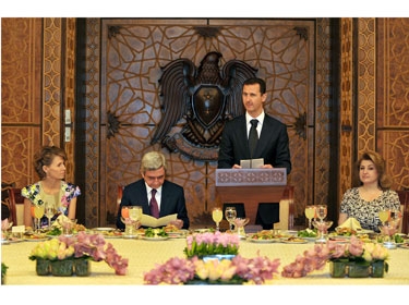 دمشق-سانا أقام السيد الرئيس بشار الأسد والسيدة عقيلته مساء أمس مأدبة عشاء على شرف الرئيس الأرميني سيرج سركسيان والسيدة عقيلته حضرها أعضاء الوفدين الرسميين وكبار المسؤولين في الدولة وفعاليات اجتماعية واقتصادية وثقافية. الرئيس الأسد: فتح آفاق جديدة للتعاون والتنسيق والتفاهم على …