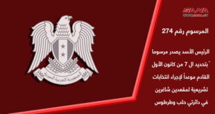 دمشق-سانا بناء على أحكام الدستور وعلى قانون الانتخابات العامة رقم (5) تاريخ 24- 3- 2014، أصدر السيد الرئيس بشار الأسد المرسوم رقم (274) بتحديد يوم السبت الواقع في السابع من شهر كانون الأول من عام 2024 للميلاد، موعداً لإجراء الانتخابات …