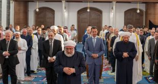 حمص-سانا أدى السيد الرئيس بشار الأسد صلاة عيد الأضحى المبارك صباح اليوم في رحاب جامع الصحابي الجليل خالد بن الوليد في مدينة حمص. وأدى الصلاة مع الرئيس الأسد وزير الأوقاف والمفتي العام للجمهورية ومحافظ حمص وأمين فرع حمص لحزب البعث …