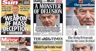 لندن-سانا أكملت الصحف البريطانية اليوم ما بدأه تقرير لجنة التحقيق البريطانية بخصوص مشاركة بريطانيا في احتلال العراق الذي صدر أمس وتهكمت على رئيس الوزراء الأسبق توني بلير معتبرة أنه “يهذي للدفاع عن موقفه”. وكتبت صحيفة ذي صن الأكثر مبيعا أن …