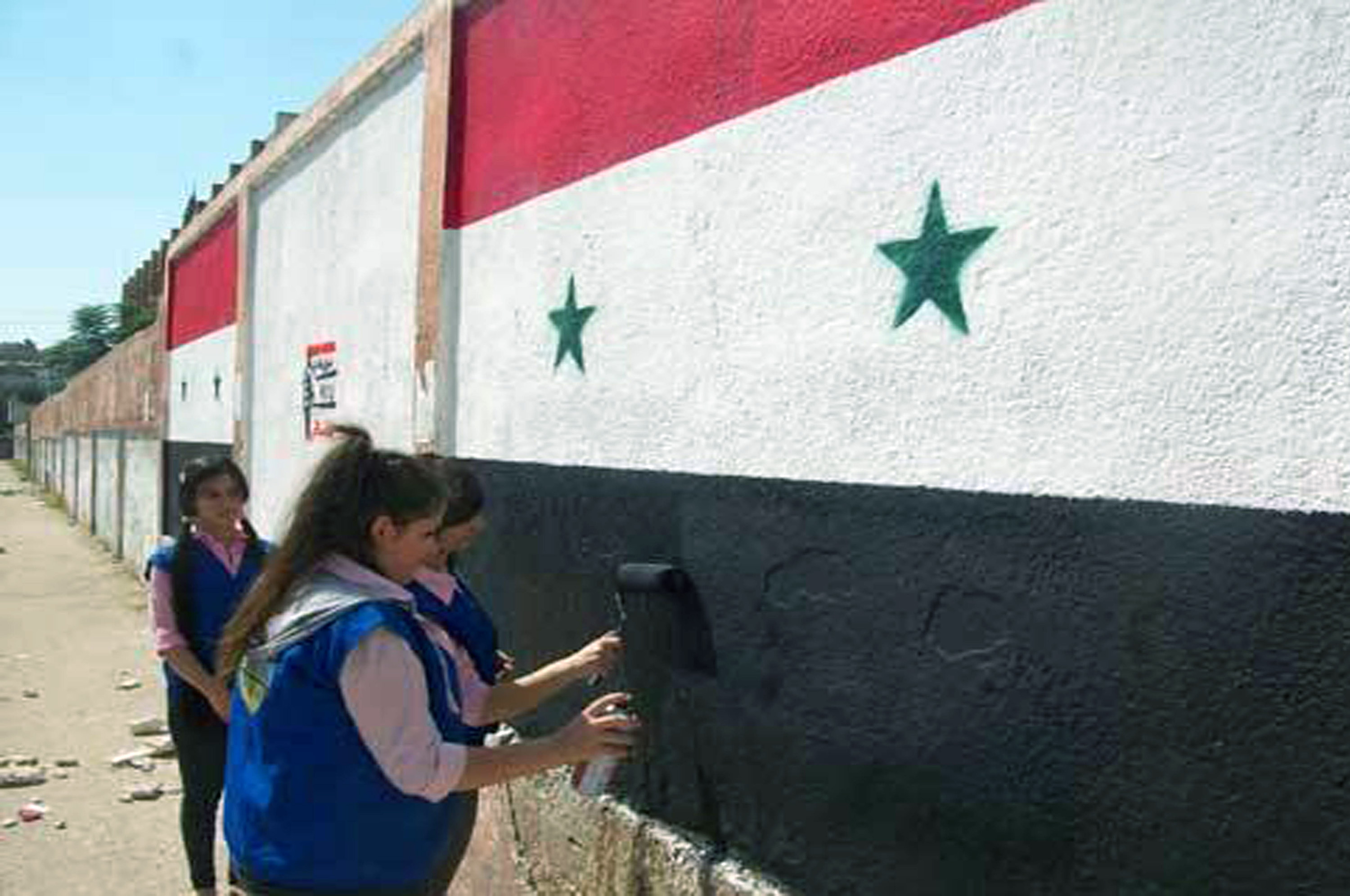 حمص-سانا بمشاركة أكثر من 900 شاب وشابة نفذ فرع منظمة اتحاد شبيبة الثورة في حمص اليوم حملة تطوعية بعنوان مدرستي بلون علمي تضمنت طلاء جدران عدد من المدارس بلون العلم الوطني.
