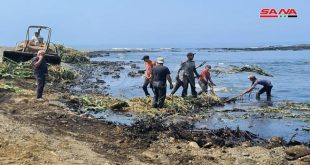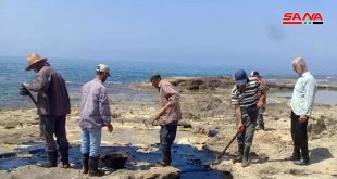 تواصل عمليات إزالة بقع تلوث الفيول التي تسربت من المحطة الحرارية في بانياس ووصلت إلى شاطئ جبلة