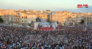 حماة-سانا احتفالاً بإنجاز الاستحقاق الرئاسي وفوز الدكتور بشار الأسد بمنصب رئيس للجمهورية العربية السورية احتشد مساء اليوم أهالي مدينة مصياف في ساحة البلدية وسط المدينة حاملين أعلام الوطن ومرددين الهتافات والأغاني الوطنية. وقال الشيخ غسان اسماعيل أن أهالي المدينة خرجوا …