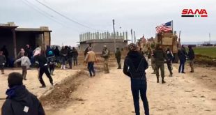 أهالي قرية خربة عمو بريف القامشلي الشرقي يعترضون طريق آليات الاحتلال الأمريكي ويرشقونها بالحجارة