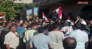 درعا-سانا تجمع المئات من أهالي بلدة إبطع وقرية أم ولد بريف درعا ترحيبا بالجيش العربي السوري ودعما له في حربه على التنظيمات الإرهابية التكفيرية. تصوير: مهند أسعد- معتز موعد