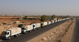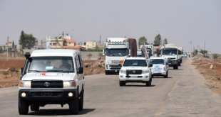 قافلة المساعدات الإغاثية والغذائية التاسعة لحظة دخولها إلى محافظة السويداء عبر ممر بصرى الشام الإنساني