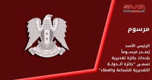 دمشق-سانا أصدر السيد الرئيس بشار الأسد مرسوماً بإحداث جائزة تقديرية تمنح للشجاعة والعطاء تقديراً وتكريماً لمن أظهر الشجاعة والبطولة والتفاني وساهم في درء المخاطر عن المواطنين أو ممتلكاتهم أو ممتلكات الدولة أو قام بعمليات الإنقاذ وتقديم المساعدة في حالات الكوارث …