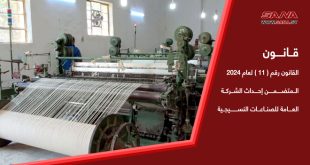 دمشق-سانا أصدر السيد الرئيس بشار الأسد القانون رقم (11) لعام 2024 المتضمن إحداث “الشركة العامة للصناعات النسيجية” لتحل محل كل من المؤسسة العامة للصناعات النسيجية والمؤسسة العامة لحلج وتسويق الأقطان، بما يسهم في تكامل حلقة الإنتاج ورفع الجودة وتحسين الأداء …