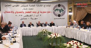 دمشق-سانا تحت شعار “مع سورية في وجه الحصار والعدوان والاحتلال” انطلق اليوم في فندق الشام بدمشق اجتماع الأمانة العامة للمؤتمر القومي العربي.