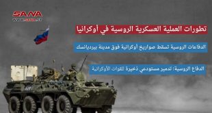 المزيدالدفاع الروسية: تدمير مستودعي ذخيرة والقضاء على مجموعات تخريب واستطلاع أوكرانية الدفاعات الروسية تسقط صواريخ أوكرانية فوق مدينة بيرديانسك دونيتسك: مرتزقة الناتو دربوا الجنود الأوكرانيين على استهداف المدنيين بالمدافع الغربية الدفاع الروسية: أولوية العمل في 2023 تحقيق كامل أهداف العملية …