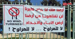 الجولان السوري المحتل-سانا جدد أهلنا في الجولان السوري المحتل رفضهم القاطع إقامة الاحتلال الإسرائيلي توربينات هوائية