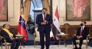 كراكاس-سانا أعلن الرئيس الفنزويلي نيكولاس مادورو أنه سيزور سورية قريباً للاحتفال مع الشعب السوري وقيادته بجو السلام والاستقرار الذي تمكنت من الوصول إليه بعد مواجهة العدوان الإرهابي عليها. وقال الرئيس مادورو خلال تقليده سفير سورية لدى كراكاس خليل بيطار وسام …