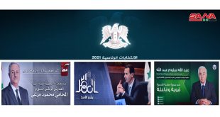 دمشق-سانا أطلق اليوم المرشحون الثلاثة للانتخابات الرئاسية التي ستجري في السادس والعشرين من الشهر الجاري داخل سورية وفي العشرين منه خارجها حملاتهم الانتخابية وذلك بعد صدور قرار المحكمة الدستورية العليا بالإعلان النهائي عن قائمة المرشحين للمنصب وهم عبد الله سلوم …