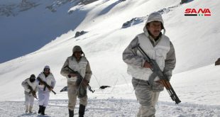 جنود الجيش العربي السوري في مواقعهم على مراصد جبل الشيخ حيث الثلوج بسماكة أمتار وتدني درجات الحرارة الى 10 درجات تحت الصفر.