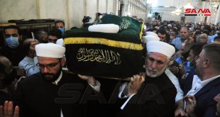 دمشق-سانا بمشاركة ممثل السيد الرئيس بشار الأسد الدكتور محمد عبد الستار السيد وزير الأوقاف شيع اليوم من الجامع الأموي بدمشق جثمان الشهيد الشيخ محمد عدنان الأفيوني مفتي دمشق وريفها الذي ارتقى مساء أمس إثر تفجير إرهابي استهدف سيارته. وفي كلمة …