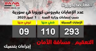 دمشق-سانا أعلنت وزارة الصحة تسجيل 10 إصابات جديدة بفيروس كورونا في سورية لأشخاص مخالطين وشفاء 3 حالات ما يرفع عدد الإصابات المسجلة إلى 279 والتعافي إلى 105 حالات. وأشارت الوزارة في بيان تلقت سانا نسخة منه اليوم إلى أن عدد …