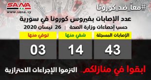 دمشق-سانا أعلنت وزارة الصحة اليوم شفاء ثلاث حالات من الإصابات المسجلة بفيروس كورونا وتسجيل إصابة جديدة ليرتفع عدد الإصابات المسجلة في سورية إلى 43 إصابة. وقالت الوزارة في بيان لها تلقت سانا نسخة منه إنه تم شفاء ثلاث حالات من …