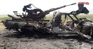 حماة-سانا ردت وحدات من الجيش العربي السوري بضربات نارية مركزة على تجمعات المجموعات الإرهابية في ريف حماة الشمالي وأحبطت محاولات إرهابييها الاعتداء على النقاط العسكرية المتمركزة لحماية البلدات الآمنة. وأفاد مراسل سانا بأن وحدات الجيش العاملة في ريف حماة الشمالي خاضت …