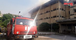 فرق الإطفاء تكافح لإخماد الحريق الذي وصل إلى مبنى مستودعات المؤسسة العامة للتبغ “الريجة” بالقرداحة