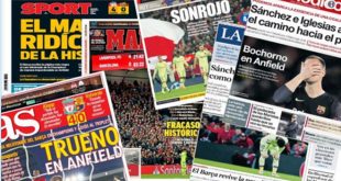 مدريد-سانا عناوين قاسية تصدرت الصحف الإسبانية الصادرة اليوم لوصف خروج برشلونة من الدور نصف النهائي لدوري أبطال أوروبا بعد خسارته أمام ليفربول برباعية بيضاء أمس رغم تقدمه بثلاثية نظيفة ذهاباً. “مثير للسخرية” و”فشل ذريع” و”كارثة جديدة” كانت العناوين التي أجمعت …