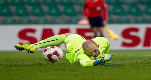 حارس المرمى السلوفاكي Jan Mucha يحاول التقاط الكرة خلال مباراة كرة القدم الودية بين سلوفاكيا وفنلندا في زيلينا بسلوفاكيا