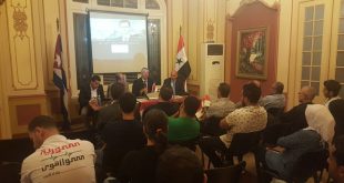 هافانا-سانا عقد فرع كوبا للاتحاد الوطني لطلبة سورية مؤتمره السنوي في العاصمة الكوبية هافانا تحت شعار “طلبة سورية في الجامعات والمعاهد كما في الجبهات صامدون ومنتصرون” بحضور الدكتور لؤي العوجى رئيس البعثة الدبلوماسية في كوبا والزميل محمد عجيل عضو المكتب …