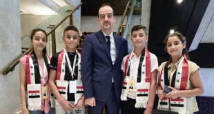 أبو ظبي-سانا التقى رئيس البعثة في السفارة السورية بأبو ظبي الوزير المستشار وائل إسماعيل الخليل مع أطفال الوفد السوري المشاركين