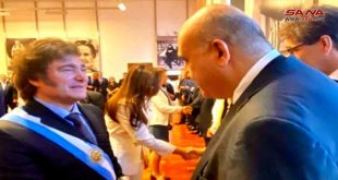 بوينس آيرس- سانا باسم السيد الرئيس بشار الأسد قدم سفير سورية في بوينس آيرس الدكتور سامي سلامة التهاني لرئيس الأرجنتين المنتخب خافيير ميلي خلال مراسم تنصيبه.