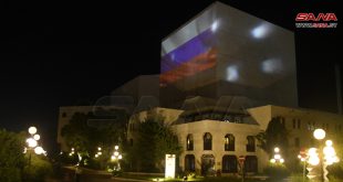 دمشق-سانا بمناسبة يوم العلم الروسي تمت مساء اليوم إضاءة مبنى دار الأسد للثقافة والفنون بمدينة دمشق بألوان العلم الروسي.