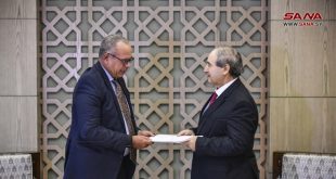 دمشق-سانا تسلم وزير الخارجية والمغتربين الدكتور فيصل المقداد اليوم نسخة من أوراق اعتماد السفير أندريه دوس سانتوس سفيراً مفوضاً فوق العادة لجمهورية البرازيل الاتحادية
