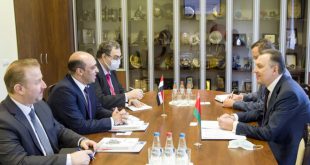 مينسك-سانا بحث سفير سورية لدى بيلاروس محمد العمراني مع رئيس غرفة التجارة والصناعة البيلاروسية فلاديمير اولاخوفيتش آفاق توسيع التعاون التجاري والاقتصادي بين البلدين. وتطرق اللقاء إلى إمكانية عقد اجتماع عبر تقنية الفيديو لممثلي رجال الأعمال السوريين والبيلاروس إضافة إلى إقامة …