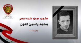 دير الزور-سانا استشهد أحد عناصر شرطة منطقة الميادين في ريف دير الزور، جراء هجوم إرهابي تعرض له.
