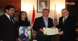 دمشق-سانا منحت جامعة دمشق اليوم أربعة من طلابها الذين ارتقوا شهداء في سبيل الوطن شهادات تخرج فخرية تقديرا لتضحياتهم وكرمت أسرهم. وأكد الدكتور محمد ماهر قباقيبي رئيس جامعة دمشق في تصريح للإعلاميين حرص الجامعة على تكريم أسر شهدائها من أساتذة …