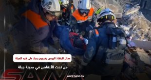 عمال الإنقاذ الروس يخرجون رجلاً على قيد الحياة من تحت الأنقاض في جبلة