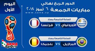 موسكو-سانا تنطلق مباريات الدور ربع النهائي من كأس العالم لكرة القدم في روسيا غداً حيث تقام مباراتان تجمع الأولى فرنسا مع الأورغواي والثانية البرازيل مع بلجيكا. ويتوقع أن تكون مباراة فرنسا مع الأورغواي التي ستنطلق عند الساعة الخامسة من مساء غد …