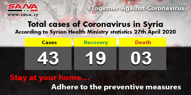The Ministry added in a statement that the number of coronavirus infections in Syria reached 43 ones until today, 19 of them have recovered while three have died.
